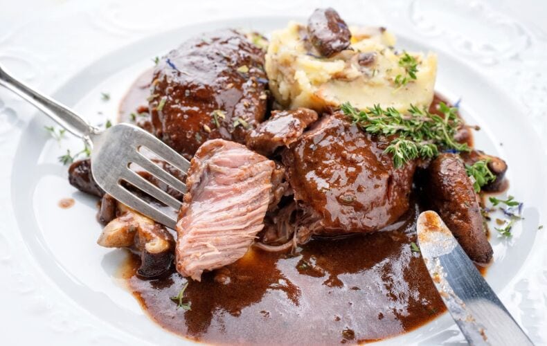 Appena raggiunta la temperatura togli le guance e metti la salsa dentro una pentola e lo fai ridurre a un quarto, appena la salsa sarà pronta togli le guance secondo le vostre porzioni e metti un po’ di salsa sopra questo piatto.